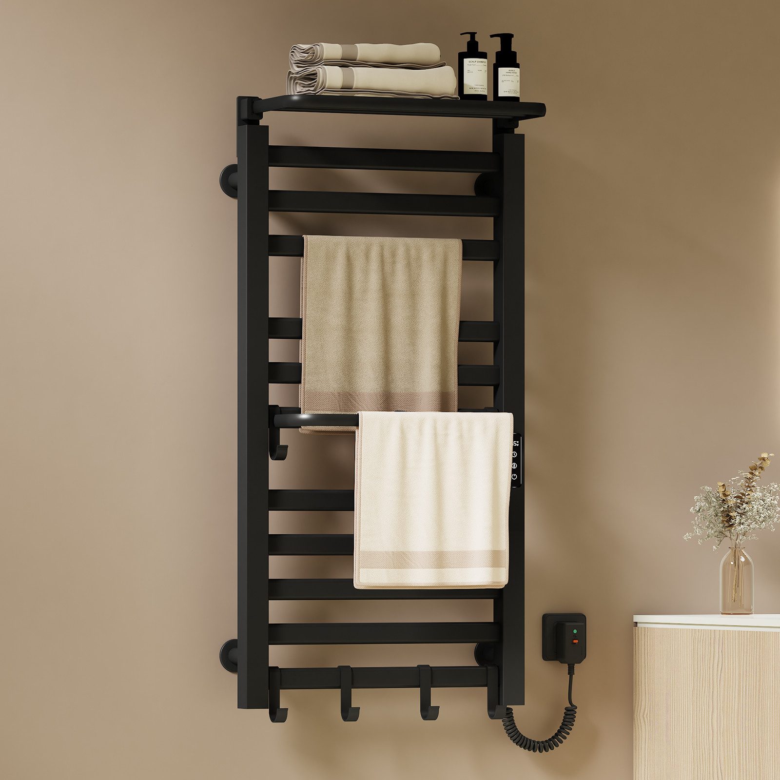 EMKE Elektrischer Badheizkörper Handtuchwärmer handtuchheizkörper mit Intelligent Thermostat, mit faltbarer Ablage Haken Gerade Handtuchhalter elektisch