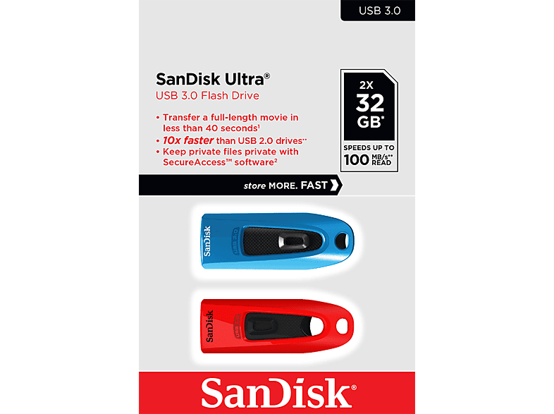 SANDISK Ultra USB-Stick, 32 GB, 100 MB/s, Blau und Rot