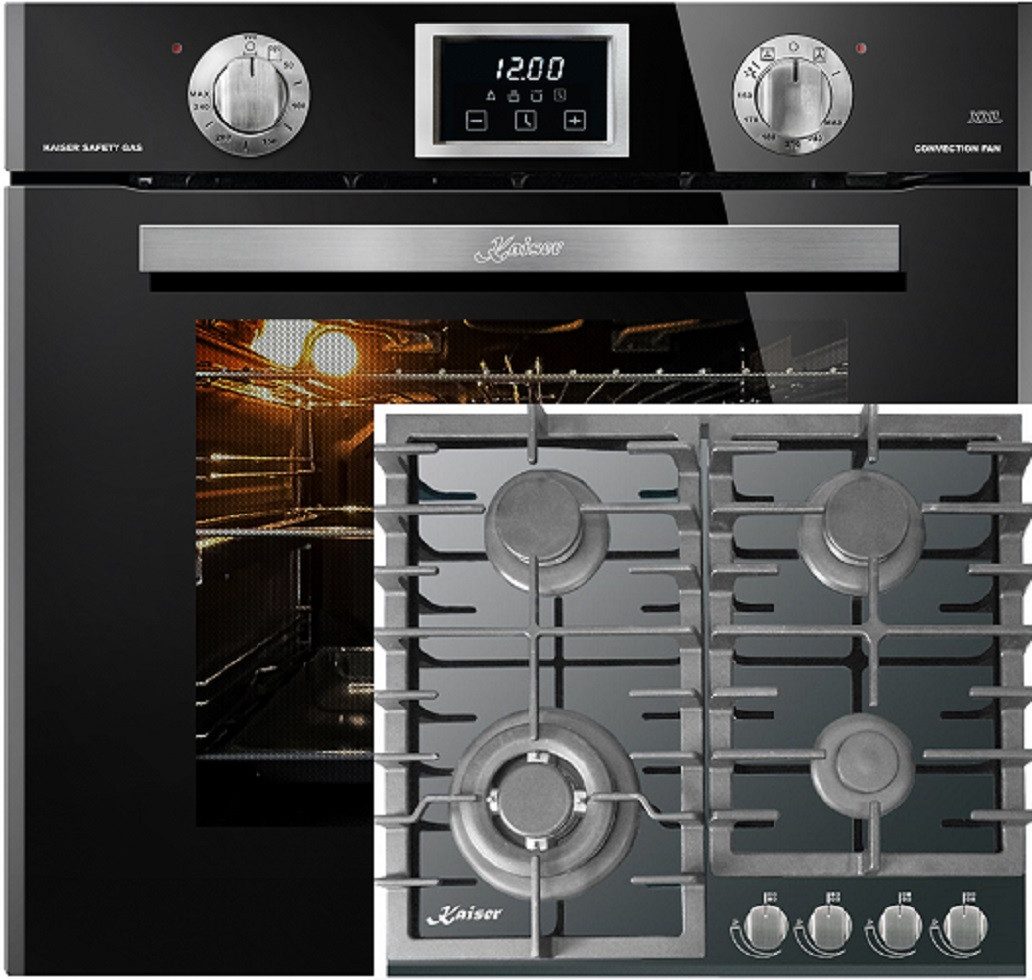 Kaiser Küchengeräte Backofen-Set EG 6374 SP+KCG 6383, mit 1-fach-Teleskopauszug, Einbau Gasbackofen Autark, 79L+60cm, Schwarz Glas, Einbau Herd