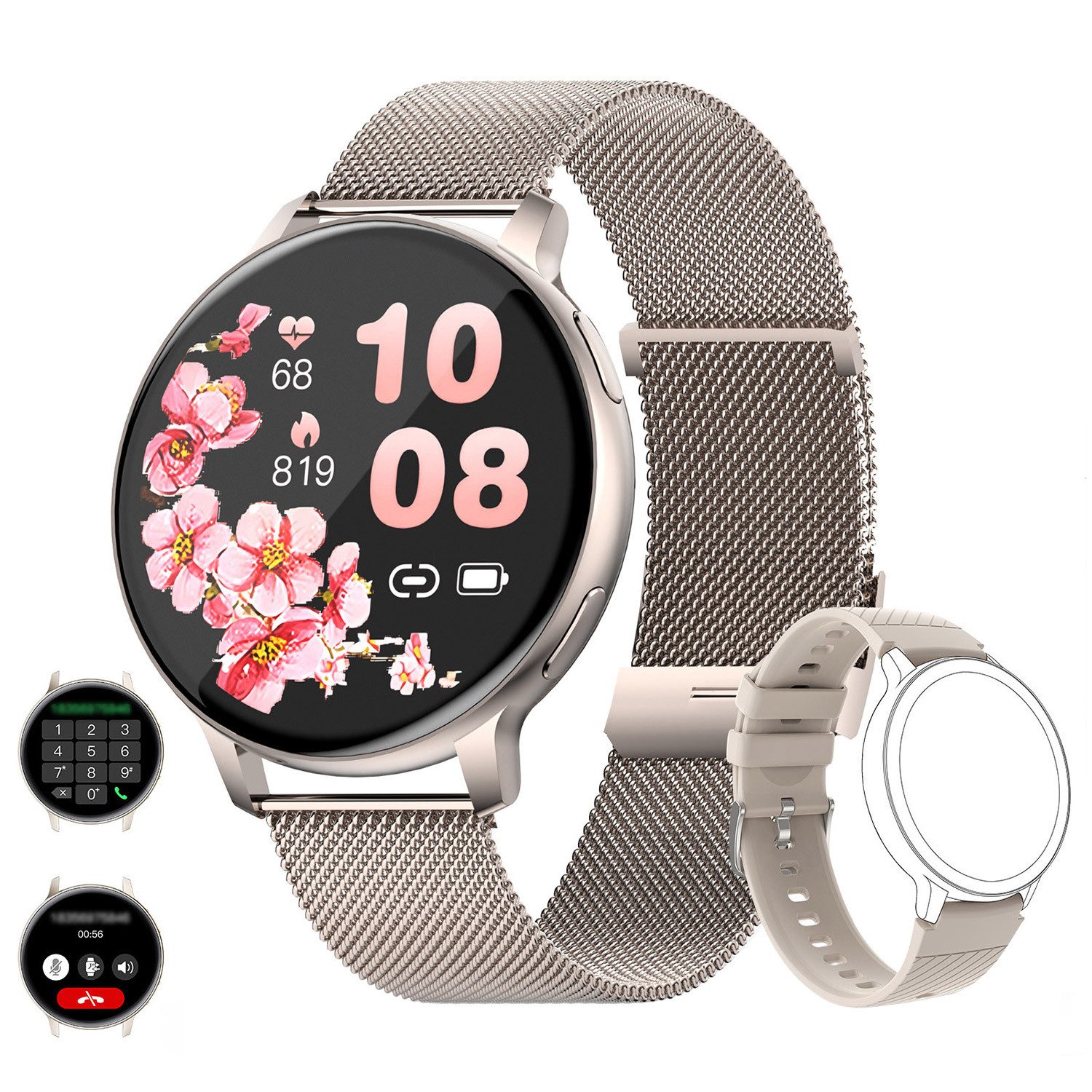 Marke: RefttenwWatch,Smartwatch,Damen Smartwatch,Herren Smartwatch,Bluetooth Smartwatch,Wasserdichte Smartwatch,Sport Smartwatch Das Set enthält zwei Uhrenarmbänder, Stahlband + Silikonarmband Wasserdichtigkeitsklasse IP67: Die Smartwatch unterstützt das wasserdichte IP67-Design, das täglichem Spritzwasser, Schweiß und kurzzeitigem Eintauchen in Wasser effektiv standhält und für verschiedene Nutzungsszenarien wie Sport und Outdoor-Aktivitäten geeignet ist. Flexibles Armbanddesign: Die Gesamtlänge des Uhrenarmbands beträgt 255 mm und der einstellbare Längenbereich beträgt 155–235 mm, sodass es sich an verschiedene Handgelenkgrößen anpassen lässt, bequem und fest zu tragen ist und für eine Vielzahl von Personen geeignet ist. Multifunktionaler Sportmodus: Die Uhr unterstützt die Überwachung mehrerer Sportmodi, darunter Laufen, Radfahren, Gehen usw., und zeichnet Sportdaten in Echtzeit auf, damit Benutzer Fitnesspläne wissenschaftlicher verwalten können. Gesundheitsmanagementfunktion: Die Uhr verfügt über eine integrierte Herzfrequenzüberwachung, Schlafanalyse und andere Funktionen, mit denen der Gesundheitszustand jederzeit verfolgt werden kann, professionelle Datenanalysen bereitgestellt werden und Benutzer dabei unterstützt werden, den Alltag und die Gesundheitsgewohnheiten zu optimieren. Anwendbare Szenarien: Die Uhr eignet sich für den täglichen Sport, Fitnesstraining, Outdoor-Aktivitäten, Schwimmen und andere Szenarien. Egal ob Laufen, Radfahren, Bergsteigen, Schwimmen, Alltagskleidung usw.