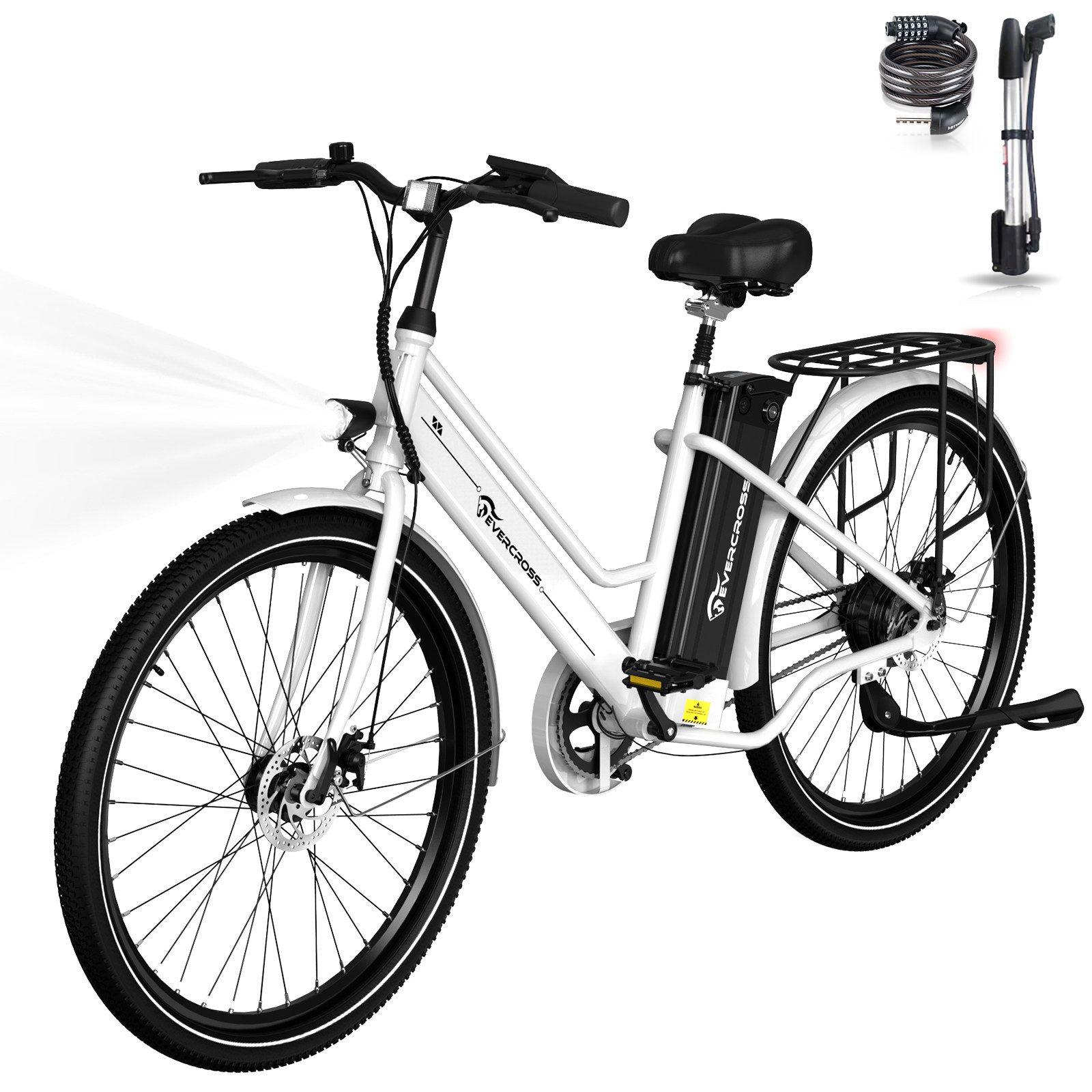 EVERCROSS TECH E-Bike Cityrad für Pendler,APP,26-Zoll-Elektrofahrrad,36V 15,6AH,60-100Km, Heckmotor, 561,6 Wh, 1 Gang, 250W, 561.6 Wh,E-Citybike mit Schloss, Pumpe